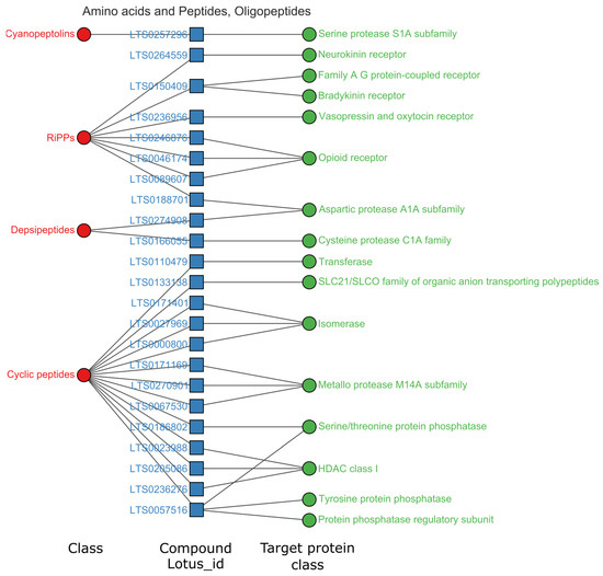 The natural products of oligopeptides had 45 high-activity entries. As shown in Figure 6, oligopeptides mainly targeted isomerase (three compounds, six entries), opioid receptors (three compounds, six entries), and HDAC class I (three compounds, five entries). These active molecules of the oligopeptides are concentrated in cyclic peptides, RiPPs, depsipeptides and cyanopeptides. Cyclic peptides mainly targeted isomerase, HDAC class I, metalloprotease, protein phosphatase, and serine/threonine protein phosphatase. Peptides of RiPPs primarily showed high activities on the targets of the opioid receptor, bradykinin receptor and vasopressin and oxytocin receptor. Depsipeptides showed high activities on targets of aspartic protease and cysteine protease. In oligopeptides, the compound LTS0057516 showed higher affinity to the 55 kDa regulatory subunit B α isoform of serine/threonine protein phosphatase 2A [15]. The compound also had multi-targets of protein phosphatase, tyrosine protein phosphatase, and serine/threonine protein phosphatase [15,16,17].