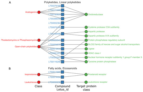 Relations among targets, compounds and chemical structure classes of linear polyketides (A) and eicosanoids (B), pChEMBL > 8. Complete data associated can be found in datasheet S2 in Supplementary Materials.