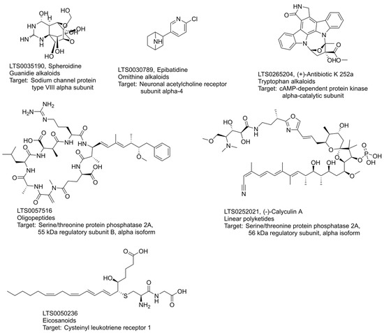 There were 415 activity entities of alkaloids with high activities on a single protein (sheet S2 in Supplementary Materials). Guanidine, ornithine and tryptophan alkaloids gave a high hit rate of more than 3.0%. Figure 4 demonstrates the connection among the classes of guanidine and ornithine, chemical compounds and targets. Guanidines and ornithines acted mainly on receptors in the central nervous system, such as acetylcholine receptors and sodium channels. Trtradotoxin mainly acted on sodium channel proteins, such as LTS0035190 (Figure 8). LTS0035190 has a potential interaction with the α subunit of sodium channel protein type VIII [14]. Tropine acted exclusively on the muscarinic or neuronal acetylcholine receptor family, such as the compound LTS0030789 (Figure 8), targeting neuronal acetylcholine receptor α4. Trtradotoxin and Tropane were the typical natural leads for developing highly selective neurological drugs.