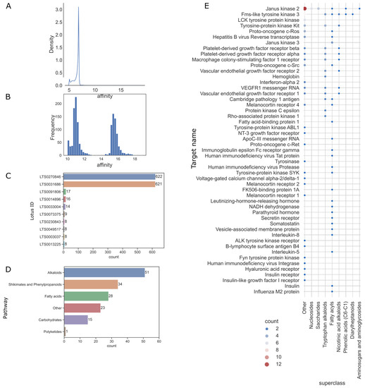 The targets set contains 622 therapeutic targets in clinical application. The predictions showed that the affinities were mainly concentrated around 6.8, as shown in Figure 9A. The high-affinity values distribution was gathered in Figure 9B. These affinity values were concentrated in the two intervals of 10–12 and 15–17. We thus selected items with an affinity of more than 10.0 as effective interactions. Two molecules (LTS0270846 and LTS0031686 in Figure 9C) showed affinities to almost all proteins. These two compounds are sulfur and hexathiepane, probably due to the high content of S elements in them. We excluded these two abnormal and non-selective compounds and, thus, obtained 152 molecules with high affinity from this virtual screen. All 152 natural molecules were counted by categories of pathways, as shown in Figure 9D. Alkaloids had the highest number (51) of high-affinity items. We then summarised the number of correspondences between the superclass and the target (Figure 9E), the tryptophan alkaloids and fatty acyls have the broadest affinity spectrum.