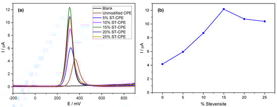 Using the buffer solution (pH 6.7), we found an excellent mass transport rate compared to other buffers. Therefore, we used PBS 0.1 M in all experiments. We investigated the electrochemical behaviour of PCT in a phosphate buffer solution (PBS, pH 6.7) by the analytical techniques CV and DPV (Figure 1). Figure 1a shows the effect of the amount of Stv on the response of the modified CPE toward PCT. The redox peak currents obtained by DPV were much more significant than the ones corresponding to the unmodified CPE. The results from Figure 1a represent evidence of the improved electrocatalytic activity of Stv clay mineral in the CPE towards PCT. The background current of unmodified CPE was smaller than that provided by the modified CPE (with different amounts of clay mineral) for the same amount of PCT, probably due to the large specific area, good conductivity of clay minerals, and a sizeable capacitive current [14]. Further, the peak current grew with the Stv clay content to 15% (Figure 1b), levelling for higher clay mineral contents.