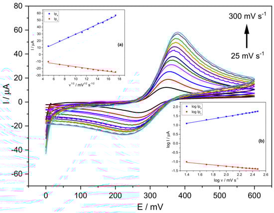 CV voltammograms of a 300 μM PCT in PBS (0.1 M, pH 6.7) and the following scan rates: 25, 50, 75, 100, 125, 150, 175, 200, 225, 250, 275 and 300 (mV s−1). (The insets show the linear fittings of (a) Ip vs. ν1/2, (b) log Ip vs. log ν). The results were obtained from CV voltammograms, employing Stv-CPE of 300 µM PCT solutions in PBS (0.1 M, pH 6.7).