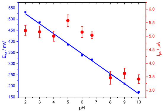 Effect of pH on the peak potential (blue) and peak current (red) for the oxidation of PCT, employing Stv-CPE, of 100 µM PCT solutions in PBS (0.1 M, pH 6.7).