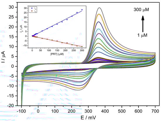 CV voltammograms for a PCT concentration range of 1–300 µM (1.0, 3.0, 6.0, 9.0, 12, 15, 18, 21, 27, 30, 60, 90, 120, 150, 180, 210, 240, 270, 300 µM) in PBS (0.1 M, pH 6.7) employing the Stv-CPE and υ = 100 mV s−1. The inset represents the plots of the Ip for anodic (blue) and cathodic (red) peaks vs. the PCT concentration (1–300 µM).