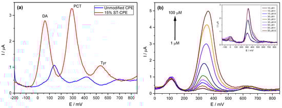 We previously analysed standard solutions containing PCT mixed with DA and Tyr to determine the possible interfering effect of compounds similar to PCT and frequently found in similar matrices. The determination of PCT using the prepared CPE was possible even in the presence of DA and Tyr, with two entirely resolved peaks on Stv-CPE for these three species (Figure 5a). However, varying the PCT concentration in the presence of fixed DA and Tyr concentrations, the peak profiles of the PCT found by DPV were similar to those achieved using standard analyte solutions (Figure 5b).