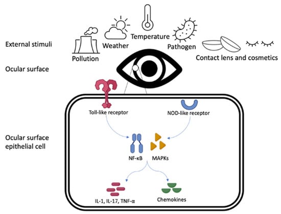 The ocular surface is directly exposed to a large array of external stimuli ranging from dust, pollution, weather, and temperature of the external environment to contact lens wear [4,5]. The epithelium of the entire ocular surface works as an immunological unit, and is important in the immunological defence against external insults. Ocular surface epithelial cells express specific immune pattern recognition receptors that can activate downstream innate and adaptive immunological cascades [2]. The triggering of receptors including Toll- and NOD- like receptors leads to the upregulation of transcription factors such as NF-κB and MAPKs, which in turn release inflammatory cytokines (e.g., IL-1, IL-17, TNF-α) and chemokine ligands, leading to both innate and adaptive immune responses [8], as shown in Figure 1. As a result, the interaction of external exposomes with the ocular surface can modulate inflammatory regulators such as cytokines, stress-response, hormones, and growth factors [9], and can initiate epigenetic mechanisms that may induce vulnerability of the ocular surface, resulting in an OSD. This paper serves to provide a current overview of the evidence on the impact of exposomes on OSDs and the proposed mechanisms of their action.