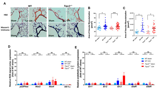 Effects of Trpc3 deficiency and CIH on the lung phenotype. (A) Histologic evaluation with H&E and Masson’s trichrome staining showed increased vascular wall thickness in WT and Trpc3−/− mice under CIH exposure. (B) Comparison of vascular wall thickness and length increased in the WT and Trpc3−/− mice under CIH exposure. (C) Comparison of vascular muscularization area revealed increases in the WT and Trpc3−/− mice under CIH exposure. (D) The mRNA expression of reactive oxygen species-related markers (p22Phox, Nox2, and Nox4) and hypoxia marker (Hif-1α) in the lung. Data are expressed as mean ± SE (n = 3). (E) The expression pattern of the endothelin system in the WT and Trpc3−/− mice, with CIH exposure in the lung. Data are expressed as mean ± SE (n = 3). (* p < 0.05, ** p < 0.01, *** p < 0.001, and ns; not significant).