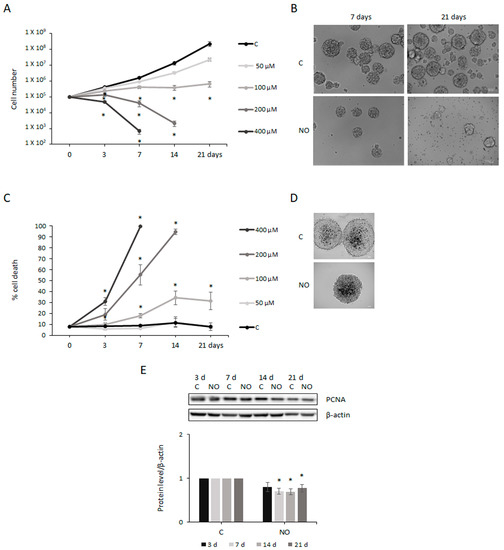 Nitric oxide (NO) inhibits Glioblastoma Stem Cells’ (GSCs) self-renewal and proliferation ability. (A) Proliferation of GSCs evaluated after treatment with different Diethylenetriamine/Nitric oxide adduct (DETA/NO, herein named NO) concentrations (50, 100, 200, and 400 µM) for 3, 7, 14, and 21 days. The mean ± SEM from more than 3 experiments is shown. * p < 0.05 vs. control cells at each time point. (B) Cultures of GSCs grown for 7 and 21 days in the absence (C) and presence of 100 µM NO. Photographs of neurospheres were taken under a phase contrast microscope (10×). (C) Cell death evaluated through Trypan blue exclusion assay following treatment with several NO concentrations and along a time course, as indicated. All the values represent the mean ± SEM from more than 3 experiments. * p < 0.05 vs. control cells. (D) Photographs show Trypan blue staining of dead cells in untreated (C) and 7 days 100 µM NO-treated neurospheres (20×). (E) Representative Western blot showing the expression of PCNA after 100 µM NO treatment at the indicated times. The protein level was normalized to β-actin, used as loading control, and values were shown with respect to the protein level in untreated cells at each time point (C), to which a value equal to 1 was arbitrarily assigned. The mean ± SEM of the densitometric analysis of more than 3 experiments is shown. * p < 0.05 vs. untreated controls.