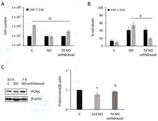 Under appropriate culture conditions (described in Section 4), patient-derived GSCs can be maintained and expanded in vitro as floating spheres [50]. In this cell model, we tested the effects of different concentrations (50, 100, 200, and 400 µM) of NO on cell proliferation over a time course of up to 21 days. No relevant changes with respect to control cells were induced by 50 µM NO. Indeed, only a permanent slowdown in cell proliferation (Figure 1A) and no changes in cell mortality (Figure 1C) were observed. On the contrary, 200 µM and 400 µM NO caused dramatic effects on the spheres’ integrity and cell proliferation (Figure 1A), resulting in the death of all cells after 14 and 7 days of exposure, respectively (Figure 1C). These results may be ascribed to the toxic effects of high NO concentrations, as indicated by the IC50 value of 170.4 µM after 7 days of treatment. Indeed, the analysis of the effects induced by 200 µM NO exposure revealed that cell proliferation prevention was associated with a rapid and dramatic increase (about 7,5-fold with respect to untreated cells) of H2AX phosphorylation (γH2AX; Figure S1A), the most widely used marker of DNA double-strand breaks (DSBs) [51], which was consistent with the observed fast total cell mortality (Figure 1C). Moreover, a marked inhibition of PCNA, which is associated with DNA replication (−40% after 7 days of treatment; Figure S1B), and no effect on cell cycle progression, except for the reduction in the G1 phase (cell growth phase) after 3 days (Figure S1C), were observed. Interestingly, an increase in Poly (ADP-ribose) Polymerase (PARP) level, which is involved in DNA repair (Figure S1A), and a decrease in the level of the stemness marker SOX2 (−23% after 7 days of treatment; Figure S1B) were also induced. Unlike the other concentration tested, 100 µM NO induced an interesting inhibitory effect on cell proliferation. Indeed, whereas with up to 7 days of NO exposure, the number of cells progressively increased, although to a significantly lower extent than control cells, at longer times of treatment the number of cells did not rise further (Figure 1A). As shown in Figure 1B, these findings were due to the impairment of both GSCs self-renewal ability, as indicated by the reduced number of neurospheres, and cell proliferation, as spheres were smaller than those generated by untreated cells. Moreover, cells in treated neurospheres were enlarged compared with untreated spheres (Figure 1B). Consistent with cell proliferation reduction, PCNA level inhibition was observed (Figure 1E). After the stabilization of cell number, significant cell death was also induced by NO (Figure 1C,D), consistent with the increasing number of single cells (Figure 1B, right). Based on these findings, the non-toxic 100 µM NO concentration was used in all subsequent experiments to investigate long-term NO activity in GSCs. To test whether the GSCs’ response to NO exposure was cell-type-specific, we compared NO-induced effects in GSCs and GBM differentiated cells. Therefore, 100 µM NO was also tested on the U87MG cell line, a well-established glioblastoma cell model which resembles the bulk tumor. Interestingly, also in this cell system, treatment for over 7 days prevented cell population expansion (Figure S2A), but only a weak increase in cell death were observed (Figure S2B). As shown in the pictures in Figure S2C, NO treatment induced severe changes in U87MG cell morphology, as cells with long and thin cell processes or enlarged cell bodies could be observed.