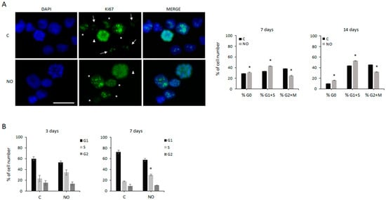 To investigate the effects induced by NO on cell proliferation, we evaluated possible changes in cell cycle progression. To this aim, we analyzed the expression of the nuclear protein Ki67, which is widely used as a proliferation marker, using immunofluorescence analysis. Indeed, quiescent cells do not express Ki67, which shows typical patterns in different cell cycle phases [52]. In particular, during the G1 and S phases, Ki67 is mostly aggregated in many small foci, whereas the G2 phase is characterized by rare and large Ki67 foci usually corresponding to nucleoli, and during mitosis Ki67 traces chromosomes. The analysis of Ki67 patterns in GSCs showed that after 7 and 14 days of NO exposure, the number of cells in the G1/S phases increased (up to +30%), whereas the number of cells in G2/M was reduced (−30%; Figure 3A) compared with untreated cells. In parallel, the number of Ki67− cells increased to +60% after 14 days of NO administration. To further investigate the NO-dependent GSCs’ cell cycle regulation, cells were also analyzed with FACS. Consistent with the distribution of Ki67 foci, accumulation of GSCs in the S phase after 3 and 7 days of NO treatment was revealed (Figure 3B).