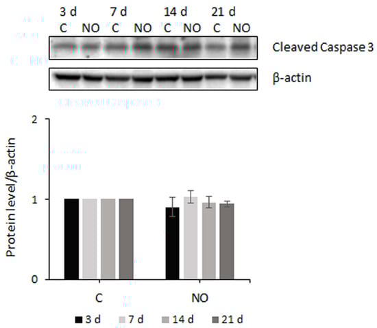 We asked whether apoptosis could participate in NO-induced cell proliferation impairment. No evidence of nuclear integrity loss was observed by immunofluorescence staining (Figure 2E and Figure 3A), and none of a sub-G1 population was revealed by FACS analysis (Figure 3B). Since the analysis of apoptosis-induced translocation of annexin V to the cell surface confirmed the absence of apoptotic cells following NO exposure, we evaluated the possible activation of caspase 3, a key marker of the apoptotic cascade [55]. Unexpectedly, we observed that the 17 kDa active form of the protein was constitutively expressed in untreated GSCs (Figure 5). However, its level did not increase after NO treatment. Notably, the level of cleaved caspase 3 did not increase also after 3 and 7 days of 200 µM NO treatment when massive GSCs’ mortality and DNA damage were observed (Figure 1C and Figure S1A). Similarly to the GSCs, the analysis of U87MG cells revealed a weak expression of the active form of caspase 3, which did not increase after NO treatment (same as in Figure 5).