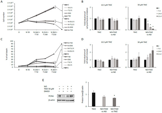 NO plus Temozolomide (TMZ) cotreatment further reduces cell proliferation. (A) Representative experiment showing the proliferation of GSCs evaluated after 7 days of treatment with 100 µM NO alone (N) and followed by combined treatment with NO and two concentrations (12.5 and 50 µM) of TMZ (N + T), or DMSO (N + D) at the same dilutions, for 7, 14 and 21 days. TMZ (T) and DMSO (D) were also tested on untreated cells (C), as a control. (B) The graphs show the effect of TMZ alone, normalized to DMSO, and the effect of the combined treatment with respect to NO administration alone on GSC proliferation. The mean ± SEM of at least two experiments is represented. * p < 0.05 vs. NO-treated cells. (C) Representative experiment showing GSCs’ death following exposure to NO (N), TMZ (T), DMSO (D), and NO plus TMZ (N + T) or NO plus DMSO (N + D), as indicated, and following the same experimental plan as described in panel (A). (D) The graphs show GSCs’ death upon TMZ administration alone and upon combined treatment analyzed with respect to NO treatment alone. Each bar represents the effect of TMZ normalized to DMSO. (E) Representative Western blot showing the effect of 21 days of 50 µM TMZ and DMSO administration, alone and in the presence of NO, on PCNA expression. The graph shows the densitometric analysis of the bands where TMZ’s effect was evaluated with respect to DMSO (left bar), cotreatment-induced changes were analyzed with respect to NO single administration (middle bar) as well as further normalized to TMZ (right bar). The mean ± SEM of two experiments is shown. * p < 0.05 vs. TMZ-treated cells.