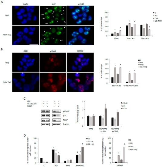 Effects of cotreatment on cell cycle progression and DNA damage. (A) Representative immunofluorescence of GSCs after 7 days of TMZ (top) and TMZ plus NO cotreatment (bottom) showing nuclei, Ki67 foci, and merged images. Ki67 staining patterns indicate different stages of the cell cycle: asterisks indicate cells in G1/S phases, arrows indicate cells in G2 phase, and circles indicate cells in G0 (Ki67− cells). The scale bar = 50 µm is the same in every image. The same analysis was also performed on GSCs untreated or treated with NO for 14 days (shown in Figure 3A). The graph shows the changes induced by the indicated treatments on the percentage of cells in different phases of the cell cycle and in G0, evaluated through the peculiar pattern of Ki67. The values were obtained from the analysis of at least 15 fields and 100–150 cells for each sample. All the values represent the mean ± SEM. * p < 0.05 vs. untreated cells; # p < 0.05 vs. TMZ-treated cells. (B) Representative immunofluorescence staining of GSCs after 7 days of TMZ (top) and TMZ plus NO cotreatment (bottom) showing nuclei, γH2AX foci, and merged images. The scale bar = 50 µm is the same as panel A. The same analysis was performed on GSCs untreated and after 14 days of NO treatment (shown in Figure 4B). The graph shows changes induced by the different treatments on the percentage of cells containing total DSBs (left bars) and cells containing only widely spread DSBs staining throughout the nuclei (right bars). The values were obtained from the analysis of at least 15 fields and 100–150 cells for each sample. All the values are represented as mean ± SEM. * p < 0.05 vs. untreated cells; # p < 0.05 vs. TMZ-treated cells. (C) Representative Western blots showing the expression of markers of the DNA damage response and repair after 21 days of exposure to 50 µM TMZ, or DMSO used at the same dilution, in the presence (right) or absence (left) of NO (TMZ and DMSO administration started 7 days after NO). The expression of each protein was normalized to β-actin. The graph shows the level of each protein after TMZ administration alone (left bars) and the changes induced by NO plus TMZ cotreatment with respect to NO (middle bars) and TMZ (right bars). The mean ± SEM of the densitometric analysis of 2 experiments is shown. (D) The left graph shows the percentage of cells with widespread DSBs in each phase of the cell cycle and in G0, identified through the peculiar pattern of Ki67, normalized to the percentage of cells in the same cell cycle phase. The values were obtained from the analysis of at least 15 fields and 100–150 cells for each sample. The values are represented as mean ± SEM. * p < 0.05 vs. untreated cells; # p < 0.05 vs. TMZ-treated cells. The right graph shows only the percentage of cells in G2 + M phase with widespread DSBs after the indicated treatments (highlighted from the left graph).