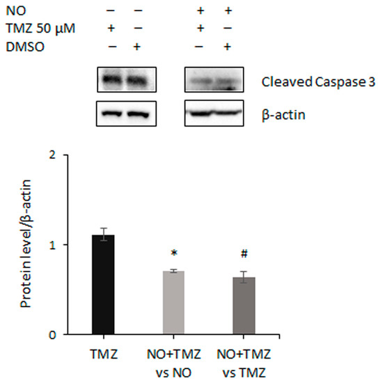 NO plus TMZ cotreatment decreases active caspase 3. Representative Western blot showing the expression of active caspase 3 in GSCs after 21 days of treatment with 50 µM TMZ, or DMSO at the same dilution, in the presence (right) or absence (left) of NO. TMZ and DMSO administration was started 7 days after NO treatment. The level of active caspase 3 was normalized to β-actin and the mean ± SEM of the densitometric analysis of 2 experiments is recorded. Left bar shows the effect of TMZ alone calculated with respect to DMSO. The middle bar shows changes induced by TMZ plus NO cotreatment with respect to NO single administration. The right bar shows the effect of combined treatment with respect to TMZ administration alone. * p < 0.05 vs. NO-treated cells; # p < 0.05 vs. TMZ-treated cells.