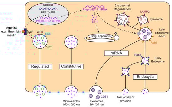 Simplified schematic diagrams of the proposed storage and release mechanisms of ET-1. ET-1 could be stored in Weibel–Palade bodies (WPB) and released via a regulated pathway or released via a constitutive pathway. ET-1 may also be recycled through the endocytic pathway. Through multivesicular bodies (MVB), there is also the possibility of storage and release of preproET-1 mRNA in exosomes. Several markers (e.g., Rab5) in this pathway have been highlighted as suggestions for future colocalisation studies.