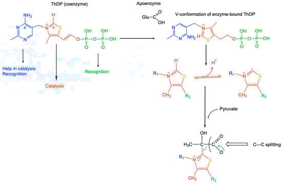 - Prajapati, S.; Rabe von Pappenheim, F.; Tittmann, K. Frontiers in the Enzymology of Thiamin Diphosphate-Dependent Enzymes. Curr. Opin. Struct. Biol. 2022, 76, 102441. [Google Scholar] [CrossRef] [PubMed]