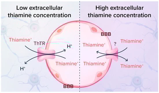 High extracellular thiamine concentrations favor a thiamine+/thiamine+ over a thiamine+/H+ exchange mode across the BBB []. Such a trans-stimulation was also observed in cultured neuroblastoma cells []. It is not clear whether the same transport protein is involved in the two modes and which compartment of the BBB would be involved in such behavior.