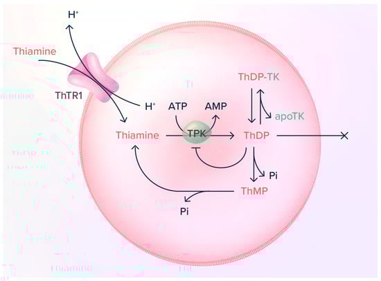 - Sambon, M.; Pavlova, O.; Alhama-Riba, J.; Wins, P.; Brans, A.; Bettendorff, L. Product Inhibition of Mammalian Thiamine Pyrophosphokinase Is an Important Mechanism for Maintaining Thiamine Diphosphate Homeostasis. Biochim. Biophys. Acta Gen. Subj. 2022, 1866, 130071. [Google Scholar] [CrossRef]