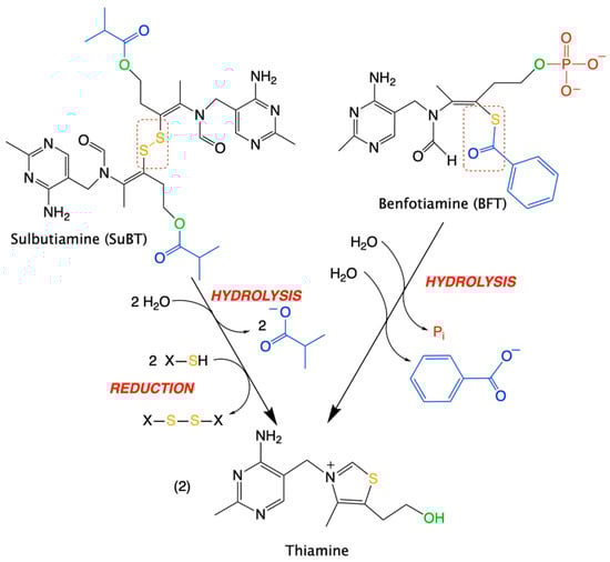 Sequences of reactions leading from SuBT (hydrolysis + reduction) or BFT (2 × hydrolysis) to thiamine. Please note that with the symmetric dimer SuBT, two molecules of thiamine are formed. Here, we suppose that the cleavage of the disulfide link in SuBT occurs via reduction by another thiol, the most obvious being reduced glutathione.