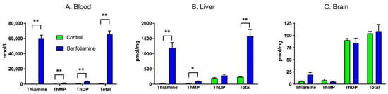 Thiamine, ThMP, and ThDP levels one hour after a single oral administration of benfotiamine (100 mg/kg) or control solution. The data were analyzed by MANOVA (Wilk’s Lambda, p = 0.0002, 0.0145, and 0.27 for blood, liver, and brain, respectively) followed by ANOVA for each thiamine compound (*, p < 0.05; **, p < 0.01). The results are expressed as mean ± SEM for 4 animals in each group. (Modified according to []).