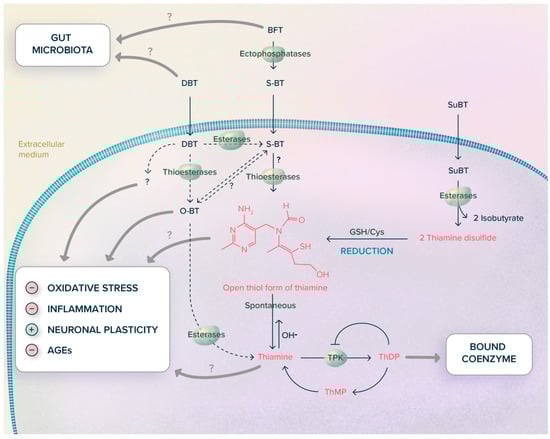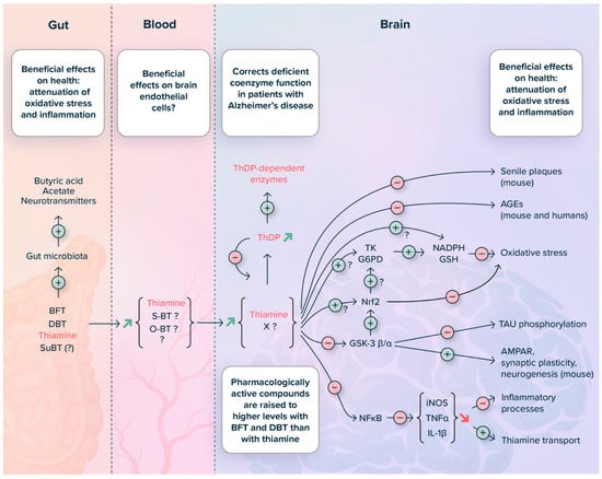 A further point requiring attention is that Alzheimer’s disease patients have lower brain and blood thiamine levels (see Section 7.1), a situation not yet reported in animal models [,]. The reason is probably that experimental animals are kept on a thiamine-rich chow, compensating for any effects of the pathology on thiamine transport. Therefore, we must expect that BFT administration in humans, in addition to its pharmacological effects, will correct thiamine levels.