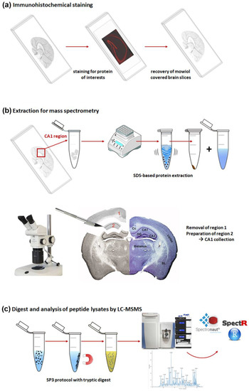 The embedded tissue sections were processed according to the scheme shown in Figure 1. The brain slices on slides already used for the immunohistochemical studies were first treated with xylene in order to gently remove the coverslip with a pair of forceps without affecting the section. Subsequent rehydration made the tissue accessible for further processing (Figure 1a). Here, we chose to investigate the CA1 region of the hippocampus and located it in the tissue slice by binocular inspection. The defined area was excised from the 30 µm-thick section representing approximately 0.1–0.2 mm3 of material. Pooled samples of eight parallel sections per mouse were used for further investigations (Figure 1b) taking into consideration the small CA1 area per slice. The detailed steps of sample extraction from the slides are shown in Supplementary Figure S1.