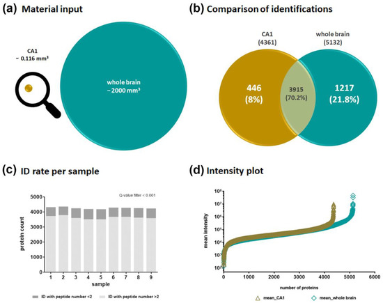 Comparison of protein identifications. (a) Starting point—used volumes of material input; (b) protein group identifications—comparison between CA1 region and whole brain extracts; (c) identification rate per sample in CA1 region samples; (d) protein intensity plot—triangle symbols based on all identified protein groups for the CA1 region extract, upright square symbols based on all identified proteins for the whole brain extract.