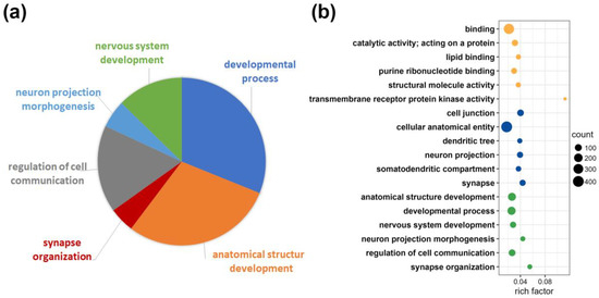 Functional enrichment analysis with g:Profiler for protein groups exclusively identified in the CA1 region. (a) Pie chart of protein portions assigned to the GO term “biological process”. (b) Rich factor representing detailed information on the categories identified by the functional enrichment analysis; ratio of differentially expressed protein number annotated in the specific pathway term to all protein numbers annotated within the pathway; yellow dots for Gene Ontology term “molecular function”; blue dots for Gene Ontology term “cellular component”; green dots for Gene Ontology term “biological process”; the size of the circles corresponds to the number of protein groups represented (counts).