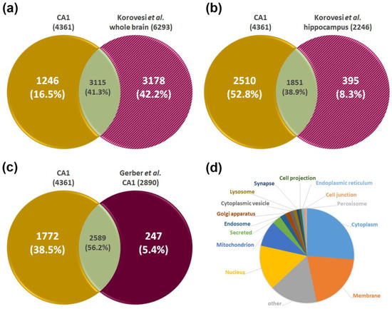 Comparative analysis of the CA1 proteome with published datasets. The CA1 proteome data are compared to the murine data set published by Korovesi et al. [23]. (a) Comparison to cumulative data of 7 brain regions mentioned as “whole brain”. (b) Comparison to the proteome reported for the hippocampus region; (c) comparison of CA1 proteome to that reported by Gerber et al. [26] derived from CA1 region dissected from fresh murine brain; (d) subcellular localization of the 1772 exclusively identified proteins (based on UniProt Knowledgebase).