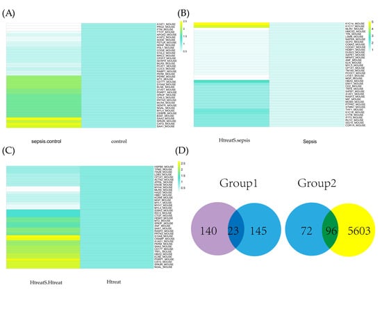 Firstly, the 21 pre-separated fractions were analyzed individually by liquid mass spectrometry, and 21 raw files of mass spectra were obtained. Then, Proteome Discoverer software (version 2.1) was used to merge into one Mascot input file containing secondary spectrogram information. Mascot software (version 2.6) can also help to perform qualitative and quantitative analysis []. The specific steps of the differential analysis for proteins were as follows: (1) count the number of peptides; (2) count the coverage of each protein; (3) count the number of peptides corresponding to each protein. p-value < 0.05 was used as the statistical criterion. Then, R package ggplot2 was utilized to exhibit the distribution of differential proteins between the hydrogen treatment sepsis group and sepsis group, sepsis group and control group, hydrogen treatment sepsis group and hydrogen treatment control group. A heatmap was also drawn using the heatmap package [] to show the special proteins in the whole experiment. In our proteomic analysis, we identified target biomarkers by analyzing the intersection of two protein sets: group1 set (those showing changes in the sepsis versus normal control groups, and those H2 treatments under conditions that have induced sepsis can also result in differences in the expression of some proteins), group2 set (those showing changes in the sepsis versus normal control groups, and those without changes in the hydrogen treatment versus normal groups). Venn diagrams were used to screen for biomarkers of these differential expressions. The aim of this criterion was to identify the hydrogen treatment target proteins and mRNAs that were closely related to sepsis.