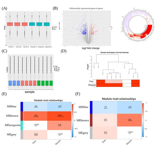 Sepsis-related mRNAs screening. (A) Boxplot for mRNA sequencing data acquired from mice model; (B) volcano plot and circle heatmap for DEGs; blue indicated down-regulated, while red indicated up-regulated; (C) boxplot for GSE23767; (D) tree distribution of representative traits and gene expression; (E,F) module analysis on the basis of dynamic color and merged color distribution.