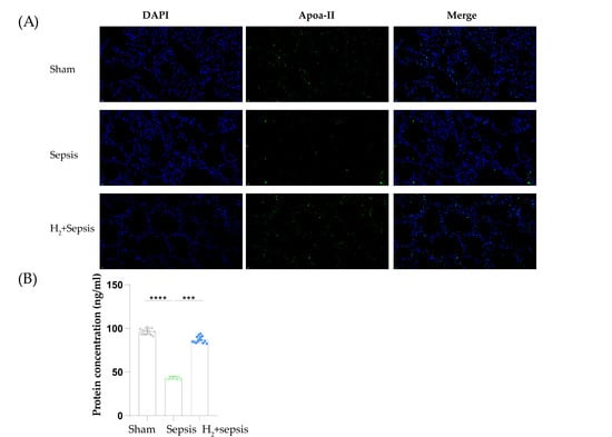 In immunofluorescence (IF) experiments, Apoa2 level was found to be significantly decreased in sepsis mice lung tissue (Figure 7A). After H2 intervention, the level of Apoa2 in the lung was restored. In the next ELISA experiment Figure 7B, Apoa2 protein levels were found to be down-regulated after the CLP model (p-value < 0.05, n = 10) and up-regulated after H2 treatment. H2 interventions would reverse negative changes in Apoa2 in the development of sepsis according to our results. These results are also consistent with the proteomics and transcriptomes analysis presented above.