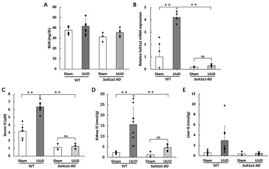 IS accumulation has been linked to CKD progression. In an ultra-performance LC-MS/MS (UPLC-MS/MS) analysis, serum IS in healthy participants was ≤0.05–3.02 mg/L. The average IS level progressively increased from 1.03 mg/L in CKD stage 1 to 12.21 mg/L in CKD stage 5 []. However, there was no significant increase in serum BUN in the WT-UUO group (Figure 1A); Sult1a1 mRNA expression and serum IS concentration were elevated in the WT UUO group (Figure 1B,C). IS administration (100 mg/kg/day, intraperitoneal) to healthy mice for 3 days has been reported to increase significantly serum and kidney IS concentrations within 3 h of the last administration [], which indicates that IS is briefly retained in the serum and kidneys, even in normal renal function.