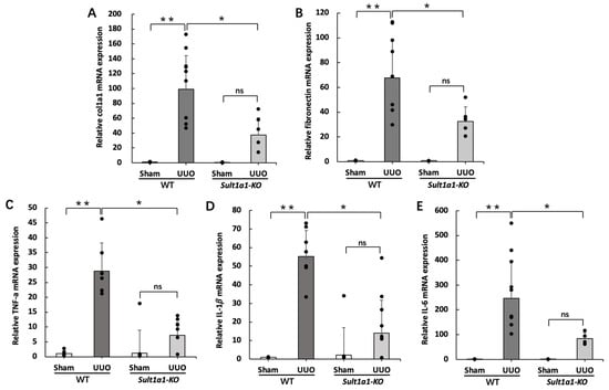 Effect of Sult1a1-KO on inflammation, renal fibrosis. (A,B) gene expression of renal fibrosis markers (col1a1, fibronectin) checked using RT-PCR. (C–E) gene expression of inflammatory cytokines (TNF-α, IL-1β, IL-6) checked using RT-PCR. Each value represents the mean ± SD of 3–9 mice. * p < 0.05, ** p < 0.01, ns: not significant.