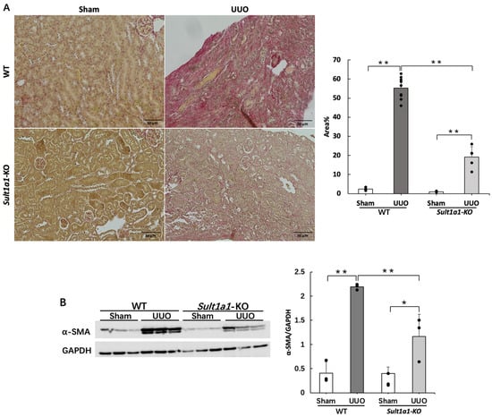 We further confirmed the effect of Sult1a1 deficiency on UUO-induced renal fibrosis using Sirius red staining and the protein expression of α-SMA. The UUO model exhibits prominent renal fibrosis. Thus, we examined whether UUO-induced renal fibrosis could be improved in Sult1a1-KO mice. Sirius red staining (Figure 3A) revealed marked collagen deposition (red part) in the kidneys of the WT UUO group, but were significantly suppressed in the Sult1a1-KO UUO group. Additionally, α-SMA protein expression, a myofibroblast marker (Figure 3B), demonstrated decreased fibrosis in the kidneys of Sult1a1-KO mice. These data indicated that UUO-induced renal fibrosis was significantly alleviated in Sult1a1-KO mice.