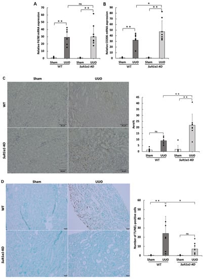 2.3. Renal Fibrosis Is Suppressed in the UUO Model Using Sult1a1-KO Mice