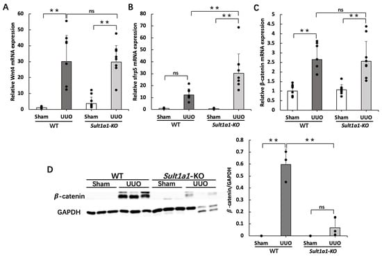 Notably, Wnt/β-catenin signaling activation triggers tubular epithelial cell transition to mesenchymal or senescent phenotype and promotes renal fibrosis []. We considered whether the Wnt/β-catenin signal affects the attenuated renal fibrosis in Sult1a1-KO mice. Notably, while Wnt4 expression was comparable in the WT UUO and Sult1a1-KO UUO groups (Figure 5A), the expression of sfrp5, which acts as a Wnt protein antagonist, was significantly increased in the Sult1a1-KO UUO group (Figure 5B). Furthermore, despite similar gene expression of β-catenin in the UUO and Sult1a1-KO UUO groups (Figure 5C), protein expression was significantly decreased in the Sult1a1-KO UUO group (Figure 5D), suggesting that a portion of the Wnt/β-catenin signaling pathway was inactivated with decreased IS accumulation.