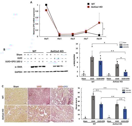 Renal EPO-producing cell plasticity governs fibrosis []. Therefore, we evaluated the time-dependent EPO mRNA expression. While EPO expression decreased in the WT UUO group after UUO surgery, it significantly improved by day 14 in the Sult1a1-KO UUO group (Figure 6A). To further investigate the role of EPO in IS-exacerbated renal fibrosis, we administered rhEPO to WT and Sult1a1-KO mice, as described in protocol 3. α-SMA increased in the WT UUO group but was significantly decreased in the Sult1a1-KO UUO group, and further decreased in the Sult1a1-KO UUO+EPO group treated with rhEPO (Figure 6B). Sirius red staining revealed similar results as those observed for α-SMA expression (Figure 6C), indicating that combining Sult1a1-KO and rhEPO treatment might prevent renal fibrosis more effectively.