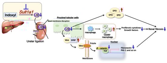 We investigated the pathological role of IS on renal fibrosis and its underlying mechanisms using Sult1a1-KO mice. Sult1a1-KO mice exhibited reduced renal fibrosis, inflammation, and apoptosis and improved EPO production. CD206+ macrophage infiltration prevents the progression of inflammation and renal fibrosis. The inactivation of Wnt/β-catenin signaling is involved in decreasing renal fibrosis; treating Sult1a1-KO mice with rhEPO further attenuated UUO-induced renal fibrosis, indicating the possibility of combination therapy in patients with CKD.