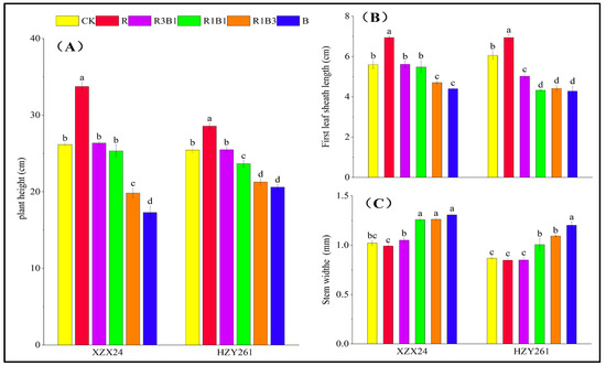 Effects of red, blue, and combined red and blue lights on plant height, first leaf sheath length, and stem width of rice seedlings. (A): Plant height, (B): first leaf sheath length, (C): stem width, CK: white light, R: red light, R3B1: 75% red light + 25% blue light, R1B1: 50% red light + 50% blue light, R1B3: 25% red light + 75% blue light, B: blue light. According to the LSD test, different lowercase letters indicate statistical differences at the 5% level between different light-quality treatments of the same variety.