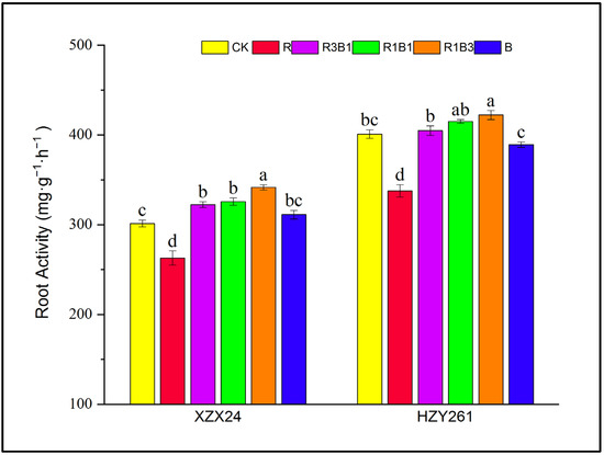 The root activity of the rice seedlings was tested by TTC reduction method [57], by obtaining 0.5 g of fresh roots of rice seedlings, adding 5 mL of TTC (0.4%) and 5 mL of phosphoric acid buffer (PH = 7.0), keeping them in a dark place at 37 °C for 1 h, then adding 2 mL of sulfuric acid (1 mol L−1) to stop the reaction, keeping them for 15 min, pouring out sulfuric acid to preserve the roots, adding 20 mL of methanol, and keeping them at 35 °C for 6 h. The root activity was measured at 485 nm with a spectrophotometer (Hitachi, Tokyo, Japan, U-2900) and the reduction amount of tetrazolium was determined by checking the standard curve.