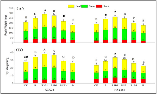 Effects of red, blue, and combined red and blue lights on fresh and dry weight of rice seedlings. (A): Fresh weight, (B): dry weight, CK: white light, R: red light, R3B1: 75% red light + 25% blue light, R1B1: 50% red light + 50% blue light, R1B3: 25% red light + 75% blue light, B: blue light. Different lowercase letters (capital letters) denote statistical differences among treatments of a cultivar root weight, stem weight and leaf weight (total weight) at the 5% level according to LSD test. Error bars above mean indicate standard error.