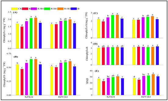 Effects of red, blue, and combined red and blue lights on pigment contents and SPAD of rice seedlings. (A): Chlorophyll a, (B): chlorophyll b, (C): chlorophyll a + b, (D): chlorophyll a/b, (E): SPAD, CK: white light, R: red light, R3B1: 75% red light + 25% blue light, R1B1: 50% red light + 50% blue light, R1B3: 25% red light + 75% blue light, B: blue light. According to the LSD test, different lowercase letters indicate statistical differences at the 5% level between different light-quality treatments for the same variety.
