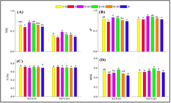 There were significant differences in NPQ, qP, Fv/Fm, and ΦPSII among different rice varieties and light-quality treatments (Figure 5). Among all light-quality treatments, the NPQ and qP under combined red-and-blue-light (R3B1) treatment were higher than those under white light, red light and blue light treatments, and the NPQ and qP of XZX24 (HZY261) rice seedlings under R3B1 treatment significantly increased by 9.14%, 3.75% (19.84%, 8.41%) compared with white-light treatment, respectively. XZX24 (HZY261) showed higher NPQ and qP values in B rather than R; however, the difference was not significant. However, there was no significant difference in the Fv/Fm of XZX24 (HZY261) between treatments (Figure 5C). Among all light-quality treatments, the ΦPSII value under combined red-and-blue-light (R1B1) treatment was higher than those under white light, red light and blue light treatments, and the ΦPSII value of XZX24 (HZY261) rice seedlings under R1B1 treatment significantly increased by 17.26% (14.19%) compared with the white-light treatment.