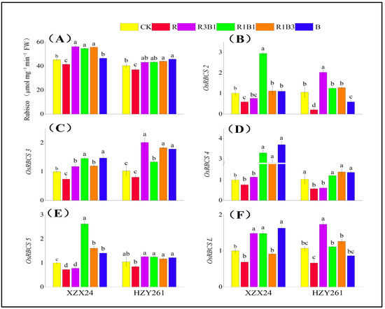As shown in Figure 7B–F, different light qualities significantly affect the expression levels of OsRBCS2, OsRBCS3, OsRBCS4, OsRBCS5, and OsRBCSL. Herein, a varying-degrees downregulation of OsRBCS2, OsRBCS3, OsRBCS4, OsRBCS5, and OsRBCSL expressions of XZX24 and HZY261 was observed under single-red-light treatment relative to CK (Figure 7B–F). At the same time, a varying-degrees upregulation of OsRBCS2, OsRBCS3, OsRBCS4, OsRBCS5, and OsRBCSL expressions of XZX24 was observed under single-blue-light treatment relative to the white-light treatment; a varying-degrees upregulation of OsRBCS3, OsRBCS4, and OsRBCS5 expressions of HZY261 was observed under the single-blue-light treatment relative to the white-light treatment. Relative to CK, OsRBCS2, OsRBCS3, OsRBCS4, OsRBCS5, and OsRBCSL expressions of XZX24 (HZY261) were downregulated and increased by 41.66%, 21.63%, 23.25%, 27.74%, and 31.20% (80.29%, 21.28%, 44.63%, 19.00%, and 37.72%) under single-red-light treatment, respectively. Relative to the single-red-light treatment, OsRBCS2, OsRBCS3, OsRBCS4, OsRBCS5, and OsRBCSL expressions of XZX24 (HZY261) were upregulated and increased by 87.16%, 99.03%, 376.33%, 94.20%, and 136.05% (184.79%, 121.45%, 139.55%, 43.95%, and 29.94%) under single-blue-light treatment, respectively. In addition, a varying-degrees upregulation of OsRBCS2, OsRBCS3, OsRBCS4, OsRBCS5, and OsRBCSL expressions of XZX24 and HZY261 was observed under the combined-light treatment relative to single-red-light treatment (Figure 7B–F).