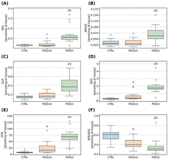 Comparison between sphingolipids in healthy (CTRL), psoriatic lesional (PSO (l)), and psoriatic non-lesional (PSO (nl)) skin. (A) Amount of sphinganine (SFA) (pmol/mg of tissue). (B) Amount of sphinganine-1-phosphate (SFA1P) (pmol/mg of tissue). (C) Amount of sphingosine-1-phosphate (S1P) (pmol/mg of tissue). (D) Amount of sphingosine (SFO) (pmol/mg of tissue). (E) Amount of ceramide (CER) (pmol/mg of tissue). (F) The ratio of sphinganine and sphingosine. Significance markers: a signifies different vs. CTRL (p < 0.05) and b signifies different vs. PSO (NL) (p < 0.05).