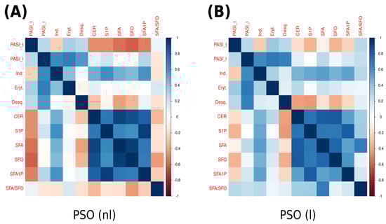 Correlation matrix (heatmap). Pearson correlation coefficients are depicted as shades of blue (positive correlation) or red (negative correlation). (A) Correlation matrix for psoriatic non-lesional (PSO (nl)) skin. (B) Correlation matrix for psoriatic lesional (PSO (l)) skin. CER—ceramide; Desq.—desquamation; Eryth.—erythema; Ind.—induration; PASI_l—psoriasis area severity index_lesional; PASI_t—psoriasis area severity index_total; S1P—sphingosine-1-phosphate; SFA—sphinganine; SFA1P—sphinganine-1-phosphate; SFO—sphingosine.