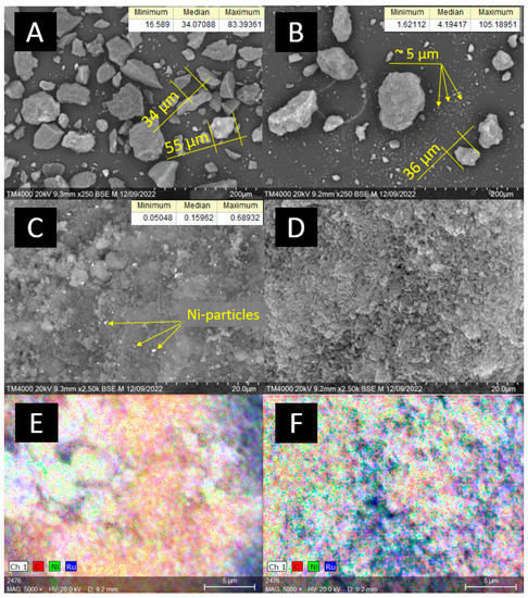 SEM images: (A,C)—10Ni3RuS450, (B,D)—10Ni3RuC400; EDX mapping: (E)—Ni, Ru on the surface of 10Ni3RuS450, (F)—Ni, Ru on the surface of 10Ni3RuC400.