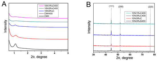 The X-ray diffraction patterns of the catalysts showed reflections of (111), (200), and (220) of the metallic form of nickel at 2θ angles of 44, 52, and 76, respectively (Figure 3). The formation of the NiRu alloy phase with (100), (111), and (101) reflexes at 2θ angles of 40, 42, and 46, respectively, was not detected, and hence the alloy was not formed. The low-angle region exhibited a reflex of the mesostructure of CM CMK-3. The ordered structure was loosened a little as a result of the oxidative treatment and the deposition of metals that was revealed by a smoothing of the characteristic peak in the 2θ region of 1.0–1.2. The nickel particle size was calculated using the Scherrer equation on the basis of the (200) reflection. The nickel particle size decreased in the series 10Ni3RuS450–10Ni3RuC–10Ni3RuC400–10Ni1RuC400, which was attributed to the higher acidity of the support and the larger specific surface area of the CM, and which corresponded well with data obtained via SEM and TEM (Table 2).