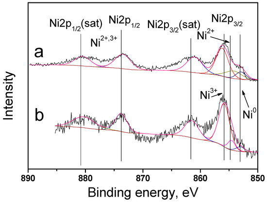 XPS spectra of Ni2p catalysts: (a)—10Ni3RuS450, (b)—10Ni3RuC400.
